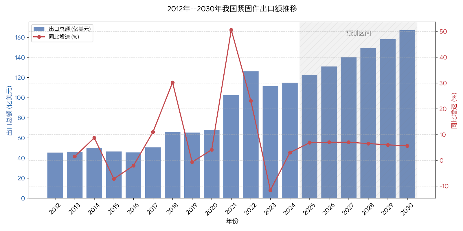 2012–2016 年间,出口规模基本维持在45–50亿美元区间;2017–2019 年随全球制造业复苏逐步回升;2021年出口额首次突破100亿美元,2022年达到约 126.13 亿美元的历史高位;2023 年受海外去库存影响出现回落,2024 年则恢复至114.74 亿美元,呈现温和修复态势。2025年上半年中国紧固件出口额同比增长 7.9%,但同期出口量增幅达到 12.9%。